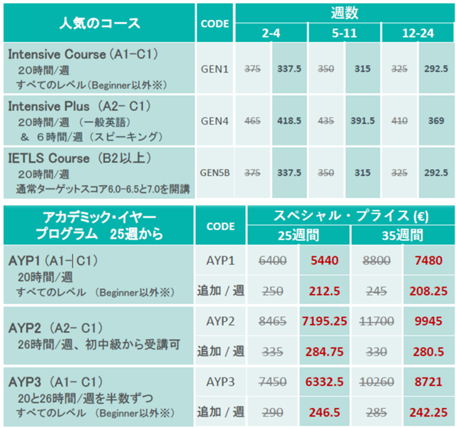 →週20時間(Intensive Course)の24週(半年間)の通常料金=7,800ユーロ