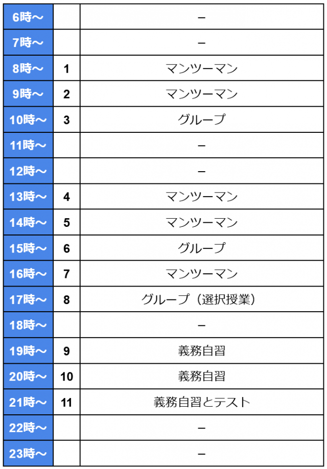 English Fellaでは朝や午前中は空き時間もあり少し緩めですが、それでも毎日義務自習が2時間半とテストがあり、11クラスしっかり勉強ができるカリキュラムになっています。